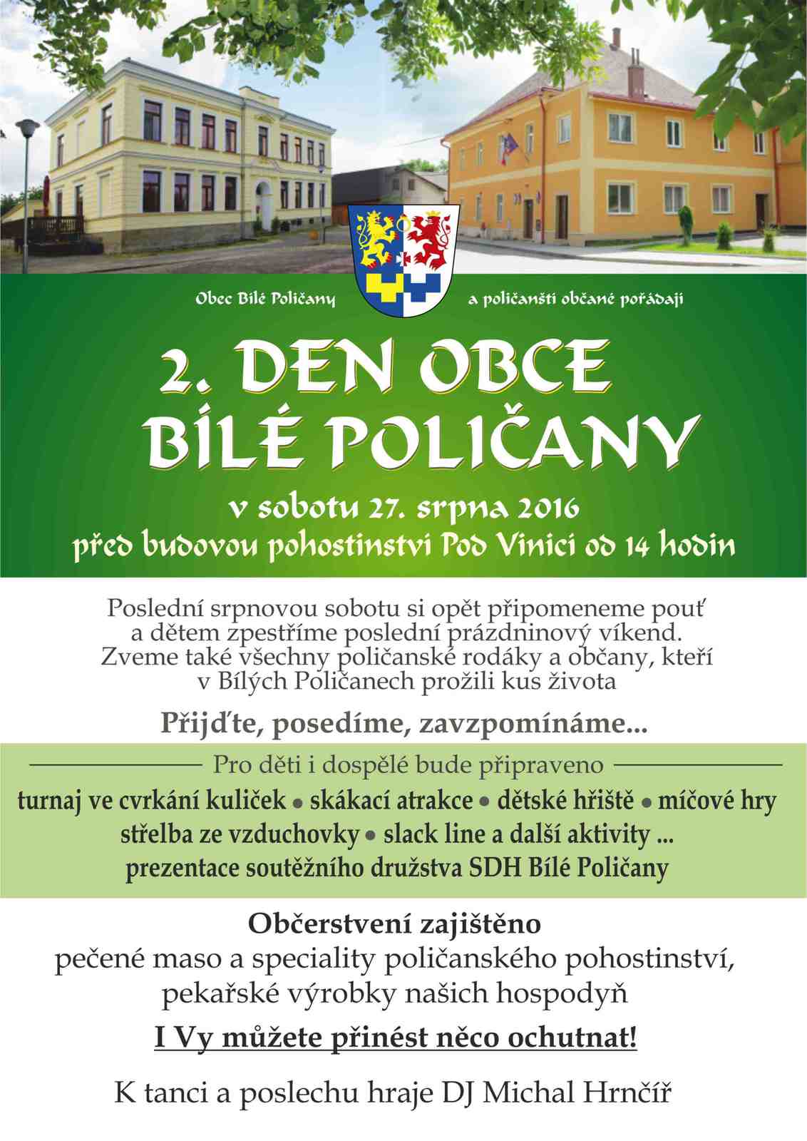 Obec Bílé Poličany a SDH Bílé Poličany pořádají a zvou všechny občany na 2. den obce. Den obce Bílé Poličany se koná opět poslední prázdninovou sobotu a to 27. srpna, začátek od 14 hodin v prostoru pohostinství Pod Vinicí. Tak jako vloni bude připraveno spousty zábavy pro děti i dospělé. Připravena je také prezentace soutěžního družstva poličanských hasičů. Takže nezapomeňte, v sobotu 27. srpna přijďte se svými dětmi, vnuky a přáteli na Den obce Bílé Poličany.