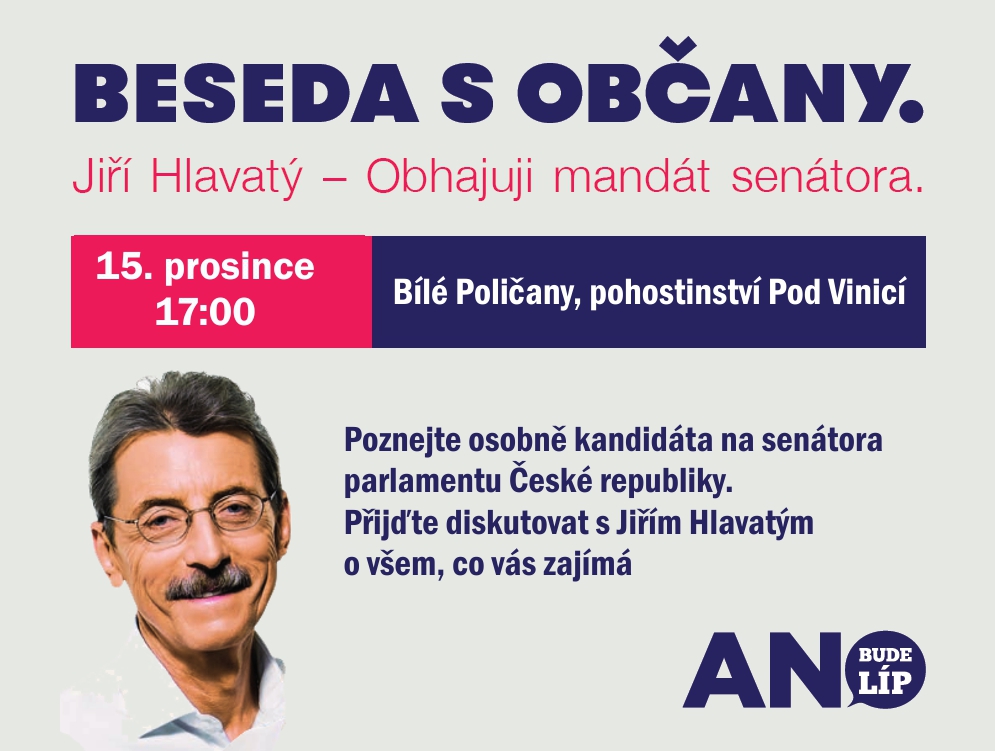 Zveme všechny občany na besedu s kandidátem na senátora Parlamentu České republiky pro okrsek Trutnov s ing. Jiřím Hlavatým. Beseda se uskuteční v pátek 15. prosince 2017 od 17:00 hodin v poličanském pohostinství Pod Vinicí. Přijďte osobně poznat kandidáta na senátora a diskutovat s ním o všem, co Vás zajímá.
