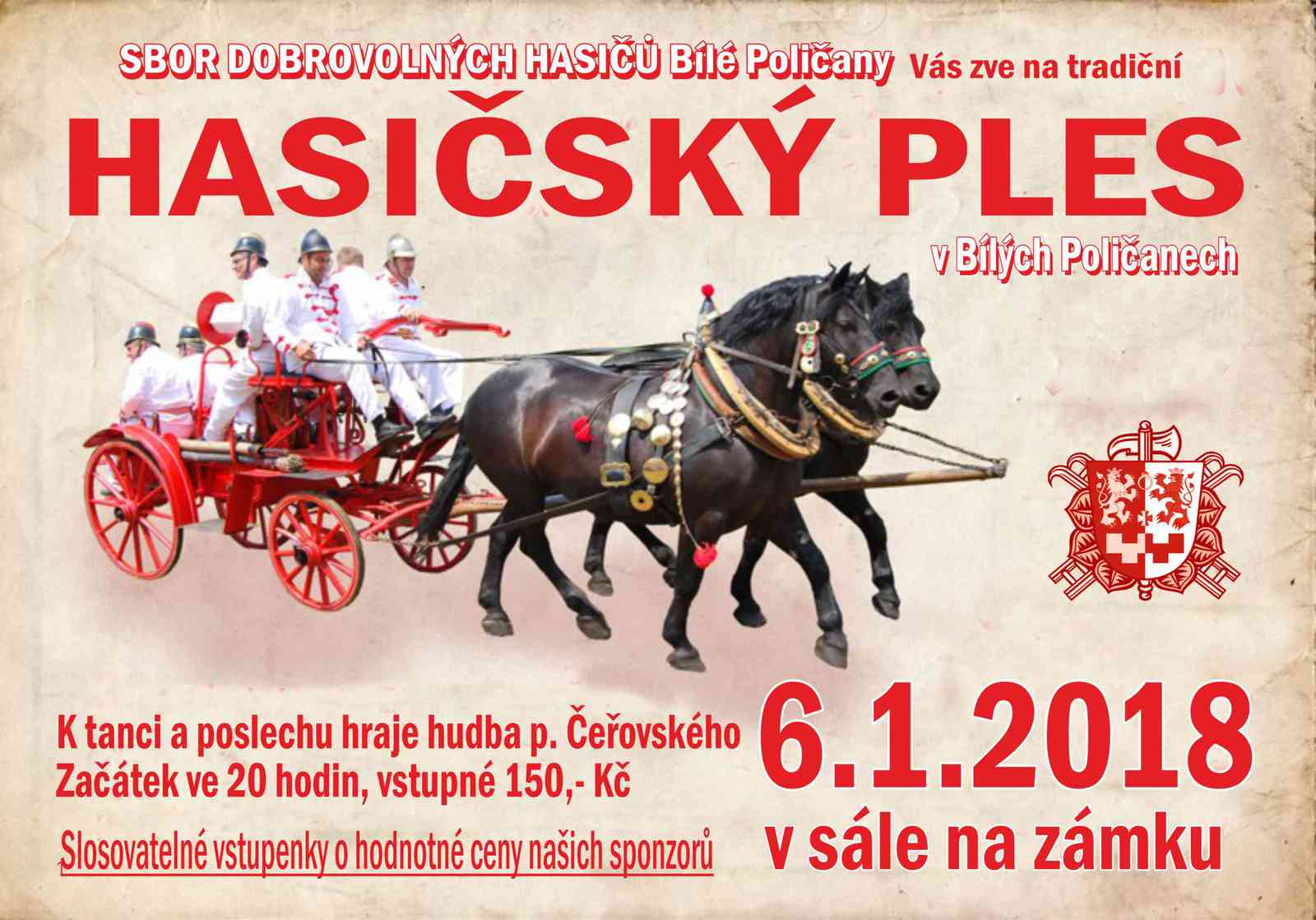 Sbor dobrovolných hasičů pořádá a zve všechny naše občany na tradiční hasičský ples. Hasičský ples se koná v sobotu 6. ledna 2018 v sále na zámku. K tanci i poslechu bude hrát hudební skupina p. Čeřovského. Začátek od 20 hodin.