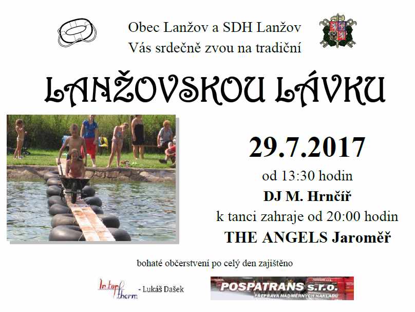 Obec Lanžov s SDH Lanžov zvou naše občany na již tradiční akci - Lanžovskou lávku. Lanžovská lávka se bude konat v sobotu 29. července 2017, začátek o půl druhé odpoledne. Hudební doprovod zajišťuje poličanská DJ Michal Hrnčíř, od 20 hodin k tanci zahrají The Angels z Jaroměře. Přejeme hezkou zábavu.