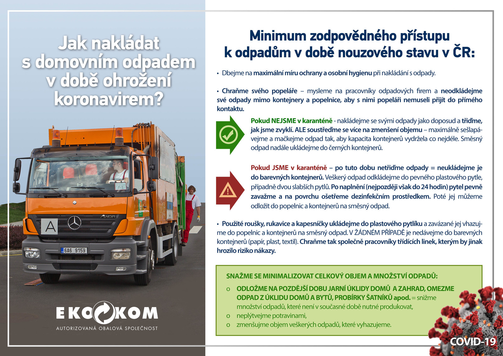 Použité roušky, rukavice a kapesníčky ukládejte do plastového pytle. Ten odkládejte uzavřený do směsného komunálního odpadu. V žádném případě je nedávejte do tříděného sběru. Žádné odpady NEODKLÁDEJTE mimo kontejnery a popelnice.