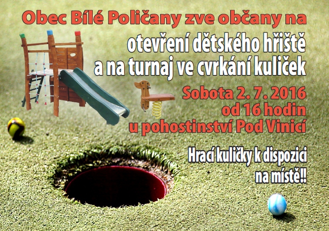 Zveme všechny občany, zejména však děti, na otevírání nového dětského hřiště. Otevírání se uskuteční v sobotu 2. července 2016 v 16 hodin u pohostinství Pod Vinicí v Bílých Poličanech. Součástí akce bude i turnaj ve cvrkání kuliček. Pro hráče budou kuličky k dispozici na startu turnaje.
