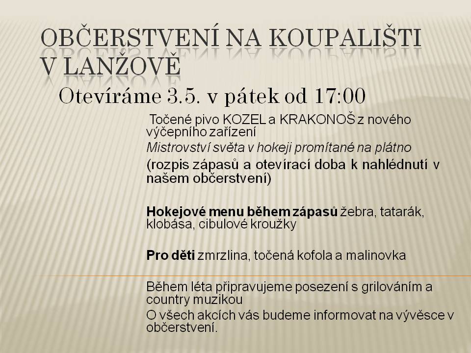 Obec Lanžov posílá informaci o otevření kiosku na koupališti v Lanžově. Provozovatel bude Břetislav Hradecký - restaurace Dubina Bílá Třemešná a chystá na sezónu 2019 zajímavé akce. Bližší informace ZDE.