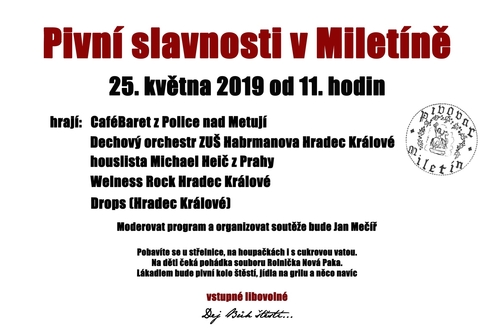 Pivovar Miletín zve i naše občany na další ročník Pivních slavností v Miletíně, které se konají 25. května 2019. Kromě dobrého piva bude i pestrý program, bližší informace se dočtete v přiložené pozvánce ZDE.