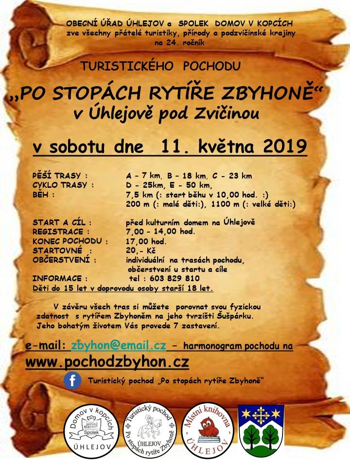 Obecní úřad Úhlejov a spolek Domov v kopcích zve všechny přátele turistiky, přírody a podzvičinské krajiny na 24. ročník pochodu "Po stopách rytíře Zbyhoně". Bližší informace naleznete na přiloženém plakátu ZDE.