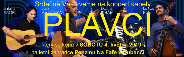 V sobotu 4. 5. 2019 od 19 hodin vystoupí na nádvoří fary populární skupina PLAVCI v čele s Honzou Vančurou. Tak neváhejte a rezervujte si své vstupenky na hezký kulturní zážitek spojený třeba s grilovanou kýtou a spoustou dalších dobrot... Rezervace vstupenek na: 603 257 405, 604 274 008. (Při nepřízni počasí by se koncert uskutečnil na sále.) Vstupné 150,-