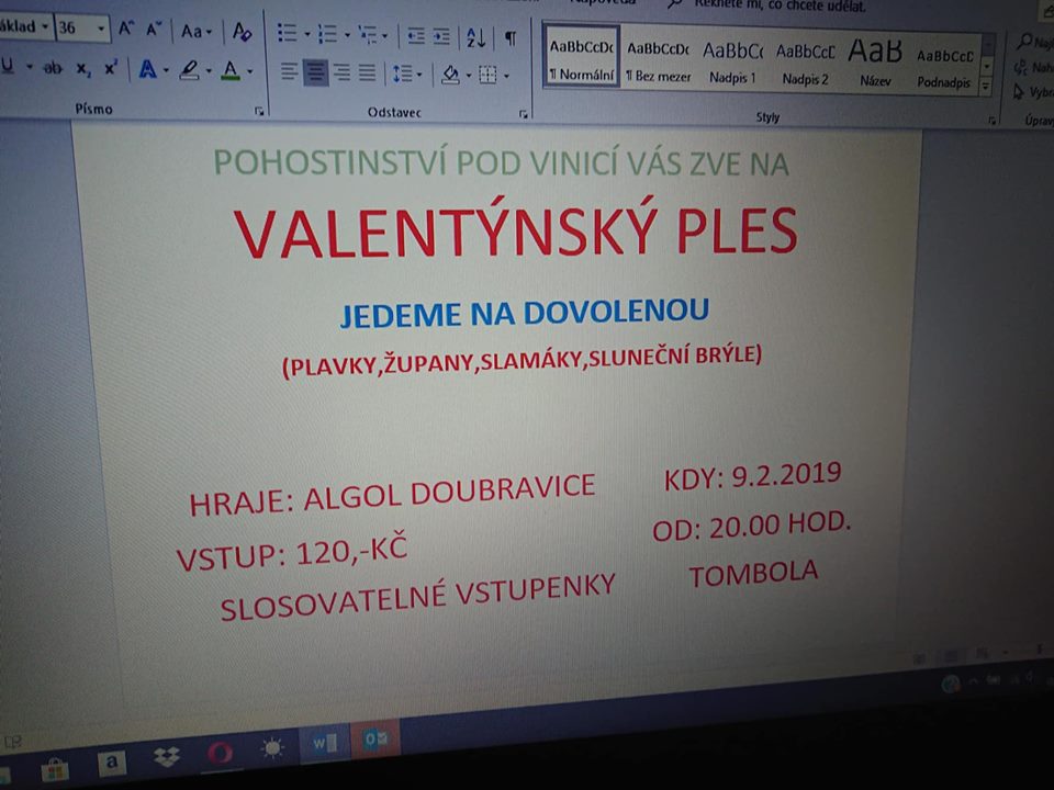 Pohostinství pod Vinicí zve naše občany na Valentýnský ples. Ples se bude konat v sobotu 9.2.2019 od 20.00 hodin. K tanci a poslechu vám zahraje Algol Doubravice. Vstupné 120 Kč. Netradiční oblečení na téma "Jedeme na dovolenou" vítáno (župany,plavky..). Bližší informace naleznete zde