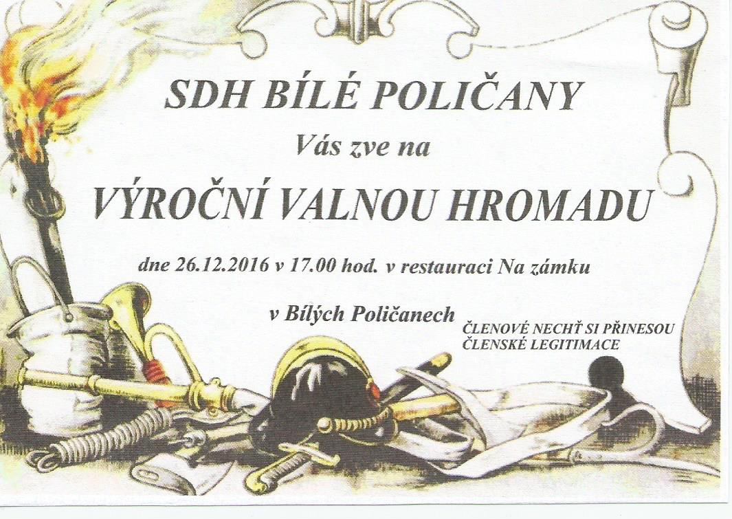 SDH Bílé Poličany zve všechny členy na Výroční valnou hromadu. Výroční valná hromada se koná 26. prosince 2016 od 17 hodin v restauraci Na zámku v Bílých Poličanech. Nezapomeňte si přinést členské průkazy SDH.