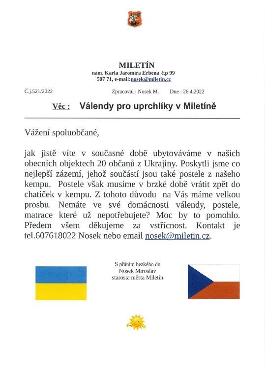 Vážení občané, zveřejňuji žádost starosty města Miletín. Máte-li nevyužitá, nadbytečná lůžka, pomozte.