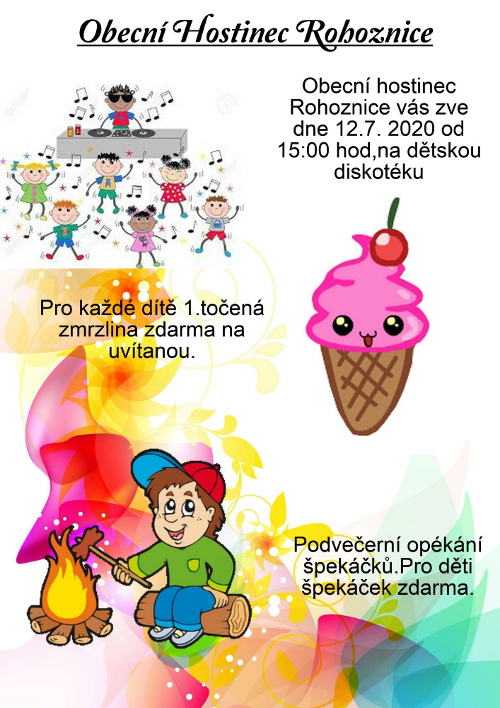 Obecní hostinec v Rohoznici zve rodiče a hlavně jejich děti na Dětskou diskotéku. Koná se v neděli 12.7.2020 od 15 hodin. Bližší informace v přiloženém letáku ZDE.
