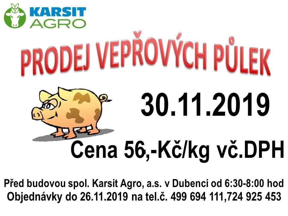 Karsit Agro, a.s. dne 30.11. 2019 opět nabízí prodej vepřových půlek. Prodej se koná před budovou Karsitu od 6.30 do 8.00 hodin. Více informací zde.