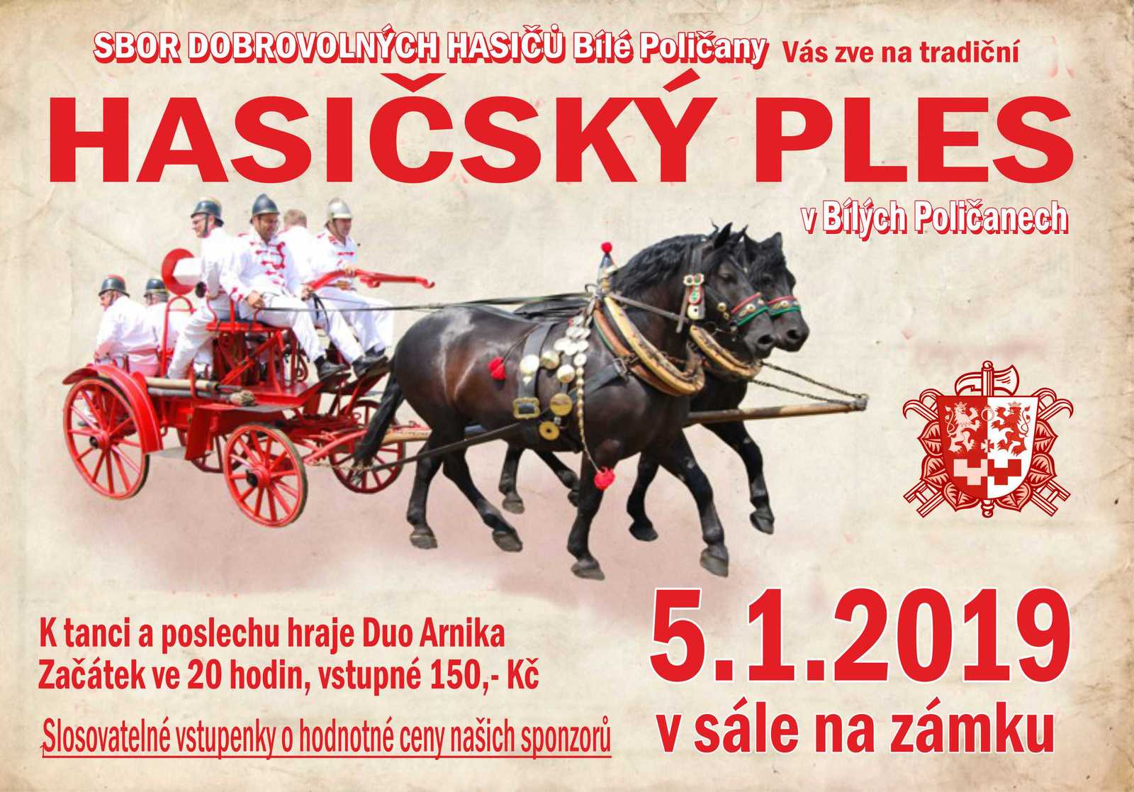 Sbor dobrovolných hasičů pořádá a zve všechny naše občany na tradiční hasičský ples. Hasičský ples se koná v sobotu 5. ledna 2019 v sále na zámku. K tanci i poslechu bude hrát hudební skupina Duo Arnika. Začátek od 20 hodin. Plakát k nahlédnutí ZDE.